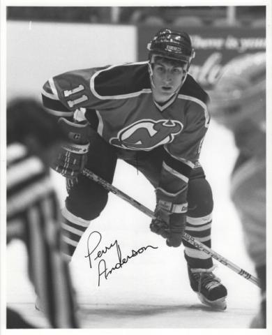 EXTREMELY RARE AUTHENTIC HAND SIGNED Perry Anderson autographed 8x10 NJ Devils photo. This photo is in near mint to mint condition. Most of the vintage photos from this collection are from the 1980's and early 1990's. These are highly collectible and virtually impossible to find. Many have the year and other info written on the back. All autographs are 100% guaranteed and come with a certificate of authenticity from www.RKSportsPromotions.com.
