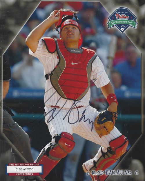 Rod Barajas (Philadelphia Phillies) autographed 8x10 Phan photo. The Limited Edition Phan photos listed on our website were obtained at Phillies games and are all serial numbered. Out of the few that were obtained at the games, very few of them have ever been seen autographed. These photos have the player's stats on the back. Some may have minor corner wear. All autographs are 100% guaranteed and come with a certificate of authenticity from www.RKSportsPromotions.com.