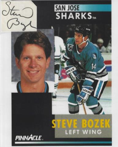 Steve Bozek (San Jose Sharks) autographed cut on an 8x10 photo. The photo and signature cut have been professionally laminated together to protect and preserve their quality and condition. By placing this authentic signature cut on the photo, it has significantly increased it's value and desirability! No more looking at a boring index card or piece of paper. Photo is in MINT condition. Please enlarge the photo to view it's resolution since some photos may be of lower resolution. All autographs are 100% guaranteed and come with a certificate of authenticity from www.RKSportsPromotions.com.