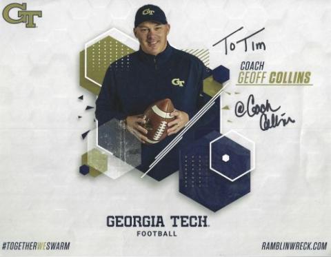 Geoff Collins (Georgia Tech) autographed 8.5x11 photo. Photo has bends throughout most of which are difficult to notice when flat. All autographs are 100% guaranteed and come with a certificate of authenticity from www.RKSportsPromotions.com.