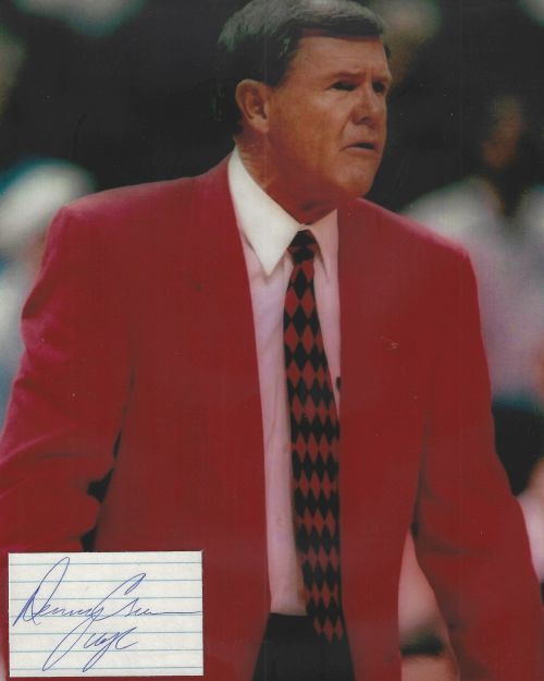 Denny Crum (Louisville Cardinals - Hall Of Fame) autographed cut on an 8x10 photo. The photo and signature cut have been professionally laminated together to protect and preserve their quality and condition. By placing this authentic signature cut on the photo, it has significantly increased it's value and desirability! No more looking at a boring index card or piece of paper. Photo is in MINT condition. Please enlarge the photo to view it's resolution since some photos may be of lower resolution. All autographs are 100% guaranteed and come with a certificate of authenticity from www.RKSportsPromotions.com.