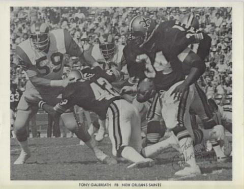 Tony Galbreath (New Orleans Saints) autographed 8.5x11 photo. This item has been professionally laminated for future protection since at one point the photo had been folded into quarters. All autographs are 100% guaranteed and come with a certificate of authenticity from www.RKSportsPromotions.com.