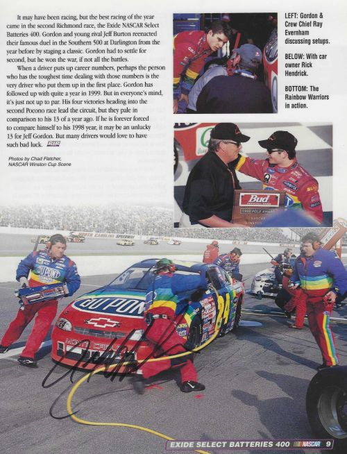 Jeff Gordon (NASCAR) autographed 8x10.5 1999 magazine page. Page has been professionally laminated to protect the signature and condition of the page. All autographs are 100% guaranteed and come with a certificate of authenticity from www.RKSportsPromotions.com.