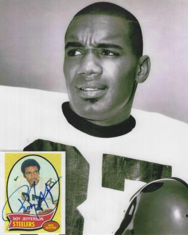 Roy Jefferson (Pittsburgh Steelers) autographed cut on an 8x10 photo. The photo and signature cut have been professionally laminated together to protect and preserve their quality and condition. By placing this authentic signature cut on the photo, it has significantly increased it's value and desirability! No more looking at a boring index card or piece of paper. Photo is in MINT condition. Please enlarge the photo to view it's resolution since some photos may be of lower resolution. All autographs are 100% guaranteed and come with a certificate of authenticity from www.RKSportsPromotions.com.