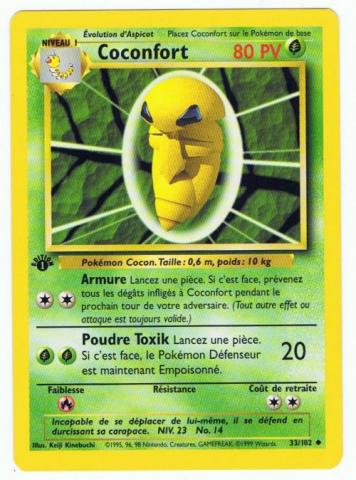 1999 Pokemon Base 1st Edition #33 Coconfort (Kakuna) in mint condition. This is the French version which has the "1st Edition" designation printed on the card. Card came directly from pack and placed directly into protective holder and has NEVER been played with!