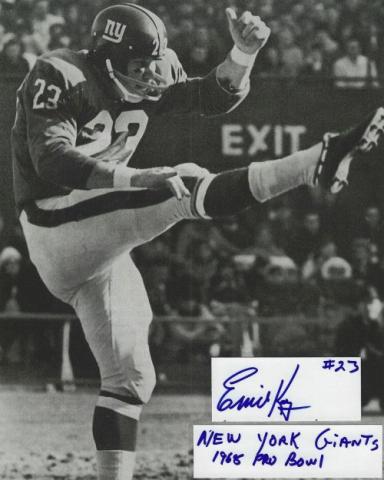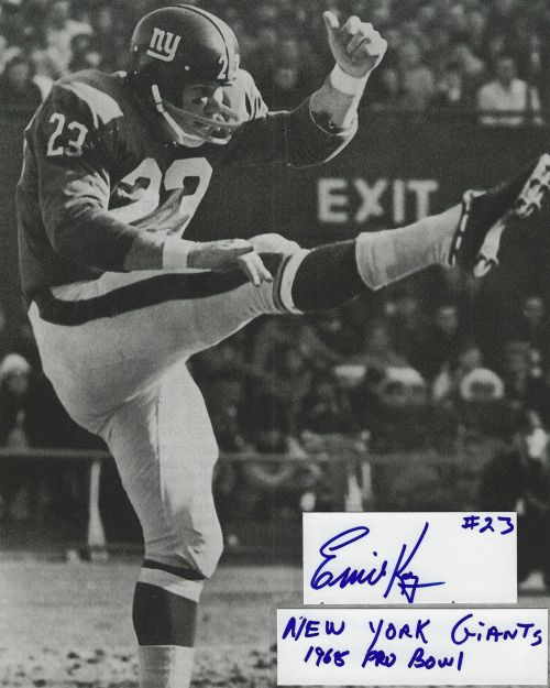 Ernie Koy Jr. (NY Giants) autographed cut on an 8x10 photo. The photo and signature cut have been professionally laminated together to protect and preserve their quality and condition. By placing this authentic signature cut on the photo, it has significantly increased it's value and desirability! No more looking at a boring index card or piece of paper. Photo is in MINT condition. Please enlarge the photo to view it's resolution since some photos may be of lower resolution. All autographs are 100% guaranteed and come with a certificate of authenticity from www.RKSportsPromotions.com.