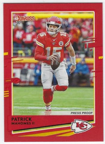 2020 Donruss #1 Patrick Mahomes Press Proof Red (Kansas City Chiefs) in mint condition.