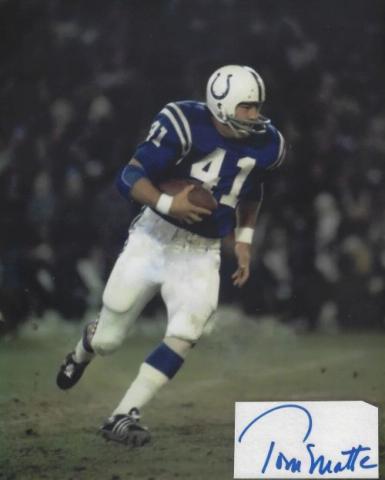 Tom Matte (Baltimore Colts) autographed cut on an 8x10 photo. The photo and signature cut have been professionally laminated together to protect and preserve their quality and condition. By placing this authentic signature cut on the photo, it has significantly increased it's value and desirability! No more looking at a boring index card or piece of paper. Photo is in MINT condition. Please enlarge the photo to view it's resolution since some photos may be of lower resolution. All autographs are 100% guaranteed and come with a certificate of authenticity from www.RKSportsPromotions.com.
