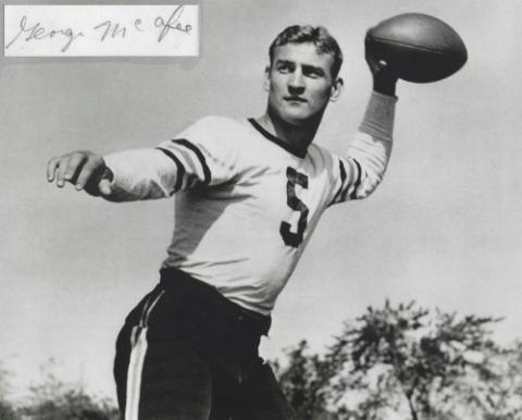 George McAfee (Chicago Bears - Hall Of Fame) autographed cut on an 8x10 photo. The photo and signature cut have been professionally laminated together to protect and preserve their quality and condition. By placing this authentic signature cut on the photo, it has significantly increased it's value and desirability! No more looking at a boring index card or piece of paper. Photo is in MINT condition. Please enlarge the photo to view it's resolution since some photos may be of lower resolution. All autographs are 100% guaranteed and come with a certificate of authenticity from www.RKSportsPromotions.com.