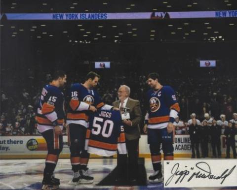 Jiggs McDonald (Hockey Broadcaster) autographed cut on an 8x10 photo. The photo and signature cut have been professionally laminated together to protect and preserve their quality and condition. By placing this authentic signature cut on the photo, it has significantly increased it's value and desirability! No more looking at a boring index card or piece of paper. Photo is in MINT condition. Please enlarge the photo to view it's resolution since some photos may be of lower resolution. All autographs are 100% guaranteed and come with a certificate of authenticity from www.RKSportsPromotions.com.