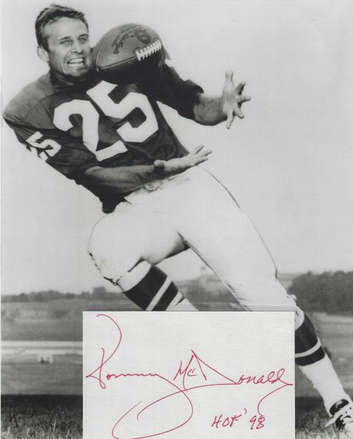 Tommy McDonald (Philadelphia Eagles - Hall Of Fame) autographed cut on an 8x10 photo. The photo and signature cut have been professionally laminated together to protect and preserve their quality and condition. By placing this authentic signature cut on the photo, it has significantly increased it's value and desirability! No more looking at a boring index card or piece of paper. Photo is in MINT condition. Please enlarge the photo to view it's resolution since some photos may be of lower resolution. All autographs are 100% guaranteed and come with a certificate of authenticity from www.RKSportsPromotions.com.