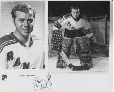 EXTREMELY RARE AUTHENTIC HAND SIGNED Peter McDuffe autographed 8x10 NY Rangers ORIGINAL PRESS photo. This photo has an error...the Rangers' logo is reversed. Please note: Most of the vintage press photos that we are offering on our website are in great condition. Most are from the 1960's and 1970's. Some photos may have bends, corner wear and in a few cases creases. These are still highly collectible and virtually impossible to find. Many have the press photo year written on the back. All autographs are 100% guaranteed and come with a certificate of authenticity from www.RKSportsPromotions.com.