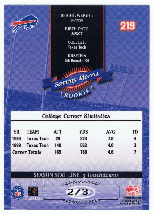 2000 Donruss #219 Sammy Morris Rookie Season Stat Line (Buffalo Bills) #2/3 in mint condition.
