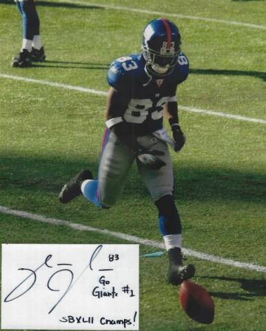 Sinorice Moss (NY Giants) autographed cut on an 8x10 photo. The photo and signature cut have been professionally laminated together to protect and preserve their quality and condition. By placing this authentic signature cut on the photo, it has significantly increased it's value and desirability! No more looking at a boring index card or piece of paper. Photo is in MINT condition. Please enlarge the photo to view it's resolution since some photos may be of lower resolution. All autographs are 100% guaranteed and come with a certificate of authenticity from www.RKSportsPromotions.com.