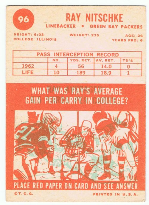 1963 Topps #96 Ray Nitschke Rookie (Green Bay Packers) in ex+ condition.