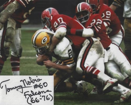 Tommy Nobis (Atlanta Falcons) autographed cut on an 8x10 photo. The photo and signature cut have been professionally laminated together to protect and preserve their quality and condition. By placing this authentic signature cut on the photo, it has significantly increased it's value and desirability! No more looking at a boring index card or piece of paper. Photo is in MINT condition. Please enlarge the photo to view it's resolution since some photos may be of lower resolution. All autographs are 100% guaranteed and come with a certificate of authenticity from www.RKSportsPromotions.com.