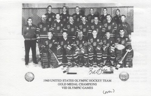 Bob Owen (1960 U.S. Olympic Hockey Gold Medal Winner) autographed 5.5 x 8.5 paper stock photo. Bob also signed this on the back (2 signatures!). Photo has a few bends but is difficult to notice when flat. All autographs are 100% guaranteed and come with a certificate of authenticity from www.RKSportsPromotions.com.