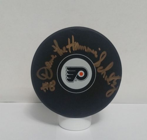 Dave 'The Hammer' Schultz (Philadelphia Flyers) autographed hockey puck. All autographs are 100% guaranteed and come with a certificate of authenticity from www.RKSportsPromotions.com.