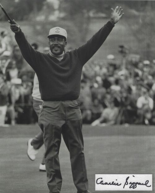 Charlie Sifford (Golf) autographed cut on an 8x10 photo. The photo and signature cut have been professionally laminated together to protect and preserve their quality and condition. By placing this authentic signature cut on the photo, it has significantly increased it's value and desirability! No more looking at a boring index card or piece of paper. Photo is in MINT condition. Please enlarge the photo to view it's resolution since some photos may be of lower resolution. All autographs are 100% guaranteed and come with a certificate of authenticity from www.RKSportsPromotions.com.