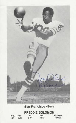 Freddie Solomon (San Francisco 49ers) autographed 5x8 photo. Photo is on thinner stock paper and has some wrinkling but is in overall nice shape. All autographs are 100% guaranteed and come with a certificate of authenticity from www.RKSportsPromotions.com.