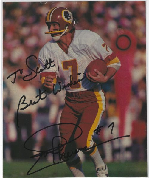 Joe Theismann (Washington Redskins) autographed 8x10 magazine photo. There is a hole in the page near his helmet. Magazine page has been laminated for protection. All autographs are 100% guaranteed and come with a certificate of authenticity from www.RKSportsPromotions.com.