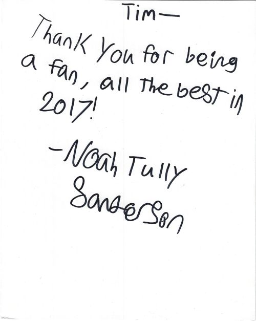 Noah Tully Sanderson autographed 8x10 photo. Noah also wrote a note and signed the back as well (2 signatures!). All autographs are 100% guaranteed and come with a certificate of authenticity from www.RKSportsPromotions.com.