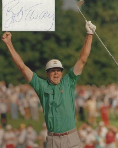 Bob Tway (Golf) autographed cut on an 8x10 photo. The photo and signature cut have been professionally laminated together to protect and preserve their quality and condition. By placing this authentic signature cut on the photo, it has significantly increased it's value and desirability! No more looking at a boring index card or piece of paper. Photo is in MINT condition. Please enlarge the photo to view it's resolution since some photos may be of lower resolution. All autographs are 100% guaranteed and come with a certificate of authenticity from www.RKSportsPromotions.com.