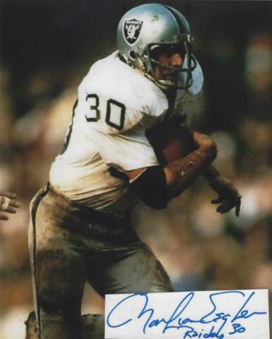 Mark van Eeghen (Oakland Raiders) autographed cut on an 8x10 photo. The photo and signature cut have been professionally laminated together to protect and preserve their quality and condition. By placing this authentic signature cut on the photo, it has significantly increased it's value and desirability! No more looking at a boring index card or piece of paper. Photo is in MINT condition. Please enlarge the photo to view it's resolution since some photos may be of lower resolution. All autographs are 100% guaranteed and come with a certificate of authenticity from www.RKSportsPromotions.com.