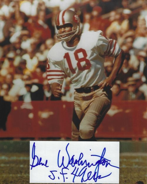 Gene Washington (San Francisco 49ers) autographed cut on an 8x10 photo. The photo and signature cut have been professionally laminated together to protect and preserve their quality and condition. By placing this authentic signature cut on the photo, it has significantly increased it's value and desirability! No more looking at a boring index card or piece of paper. Photo is in MINT condition. Please enlarge the photo to view it's resolution since some photos may be of lower resolution. All autographs are 100% guaranteed and come with a certificate of authenticity from www.RKSportsPromotions.com.