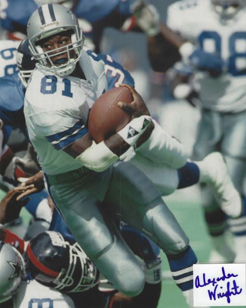 Alexander Wright (Dallas Cowboys) autographed cut on an 8x10 photo. The photo and signature cut have been professionally laminated together to protect and preserve their quality and condition. By placing this authentic signature cut on the photo, it has significantly increased it's value and desirability! No more looking at a boring index card or piece of paper. Photo is in MINT condition. Please enlarge the photo to view it's resolution since some photos may be of lower resolution. All autographs are 100% guaranteed and come with a certificate of authenticity from www.RKSportsPromotions.com.