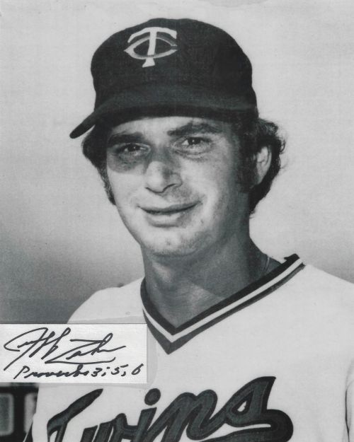 Geoff Zahn (Minnesota Twins) autographed cut on an 8x10 photo. The photo and signature cut have been professionally laminated together to protect and preserve their quality and condition. By placing this authentic signature cut on the photo, it has significantly increased it's value and desirability! No more looking at a boring index card or piece of paper. Photo is in MINT condition. Please enlarge the photo to view it's resolution since some photos may be of lower resolution. All autographs are 100% guaranteed and come with a certificate of authenticity from www.RKSportsPromotions.com.