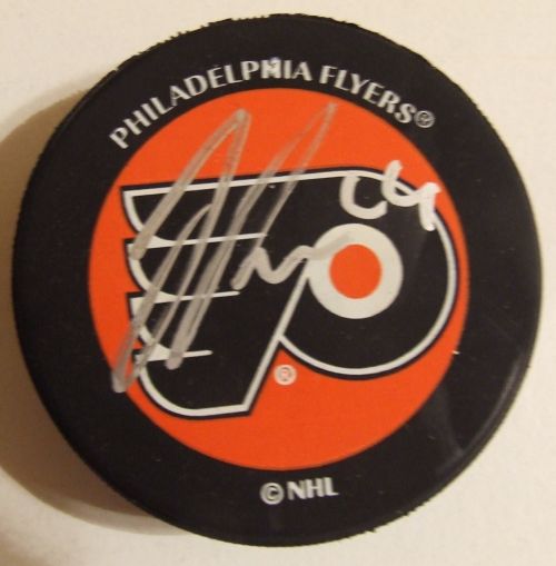Joni Pitkanen (Philadelphia Flyers) autographed hockey puck. All autographs are 100% guaranteed and come with a certificate of authenticity from www.rksportspromotions.com.
