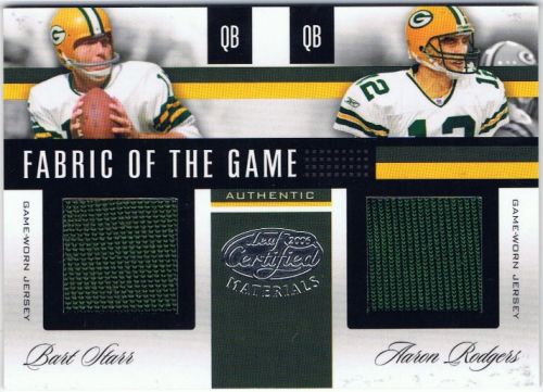 2006 Leaf Certified Materials Fabric of the Game #FOTG-1 Aaron Rodgers/Bart Starr (Green Bay Packers) #19/50 dual Game Used Jersey card in mint condition.