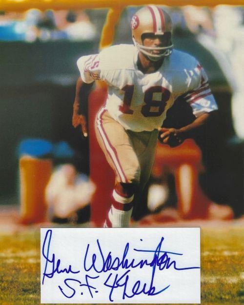 Gene Washington (San Francisco 49ers) autographed cut on an 8x10 photo. The photo and signature cut have been professionally laminated together to protect and preserve their quality and condition. By placing this authentic signature cut on the photo, it has significantly increased it's value and desirability! No more looking at a boring index card or piece of paper. Photo is in MINT condition.