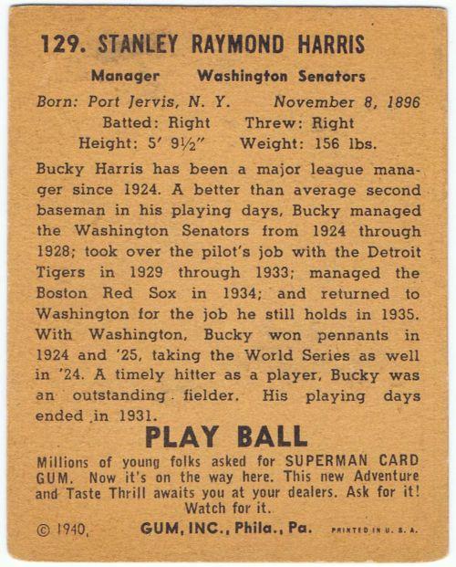 1940 Play Ball #129 Stanley 'Bucky' Harris Rookie (Washington Senators) in vg/ex condition.