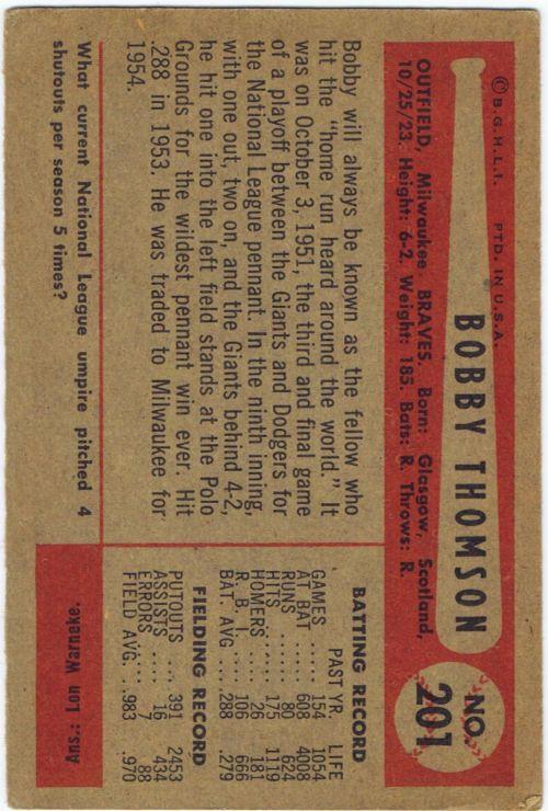 1954 Bowman #201 Bobby Thomson (Milwaukee Braves) in vg/ex condition. Top right and bottom left corners have surface wrinkles. Otherwise, card is in great shape!