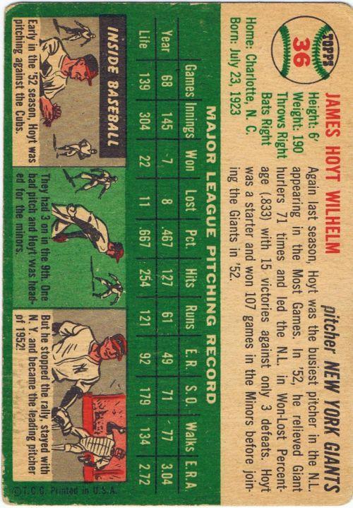 1954 Topps #36 Hoyt Wilhelm (NY Giants) in vg condition. Card has rounded corners and a small wrinkle below his neck.
